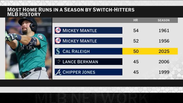 La cifra del medio centenar de jonrones se había alcanzado exactamente 50 veces en la historia de las Mayores, antes de que Raleigh la sacara el lunes, por un total de 33 jugadores distintos. Raleigh también es el primero en llegar a esa marca en 2025, ampliando la ventaja en cuadrangulares que ha mantenido durante casi toda la temporada, ahora con cinco más que Shohei Ohtani y Kyle Schwarber, quienes comparten el segundo lugar.
