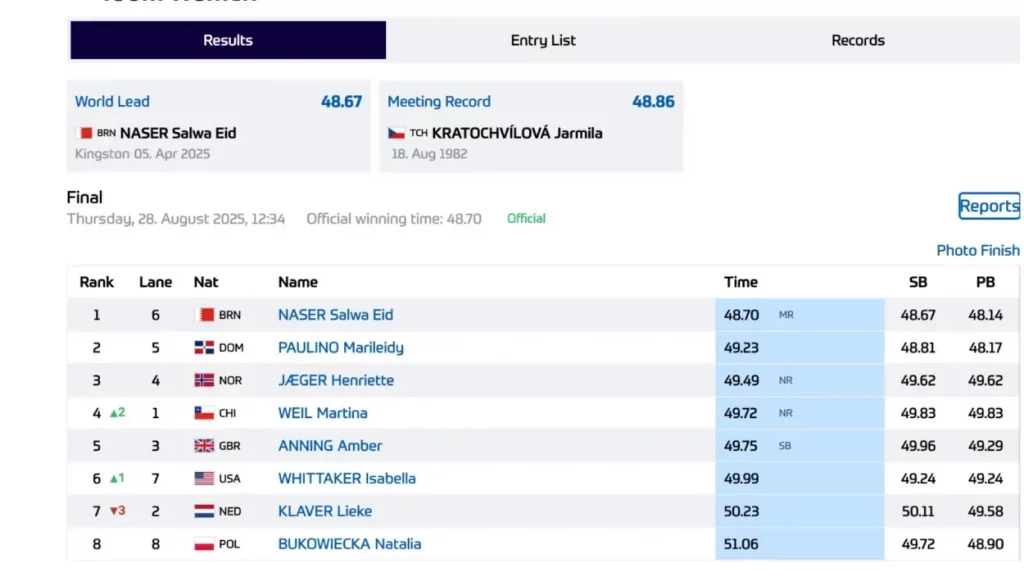 La dominicana Paulino, vigente campeona, terminó en segundo lugar al cronometrar 49.23 segundos, en tanto que la noruega Henriette Jaeger se conformó con el tercer puesto con 49.49 segundos.