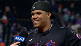 El dominicano Juan Soto con amplia sonrisa que revelan satisfacción persona por los números que está colocando con los Mets.