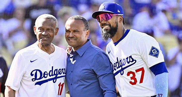 De izquierda a derecha, Manuel Mota, su hijo José Mota y el jardinero Teóscar Hernández de los Dodgers de Los Angeles.