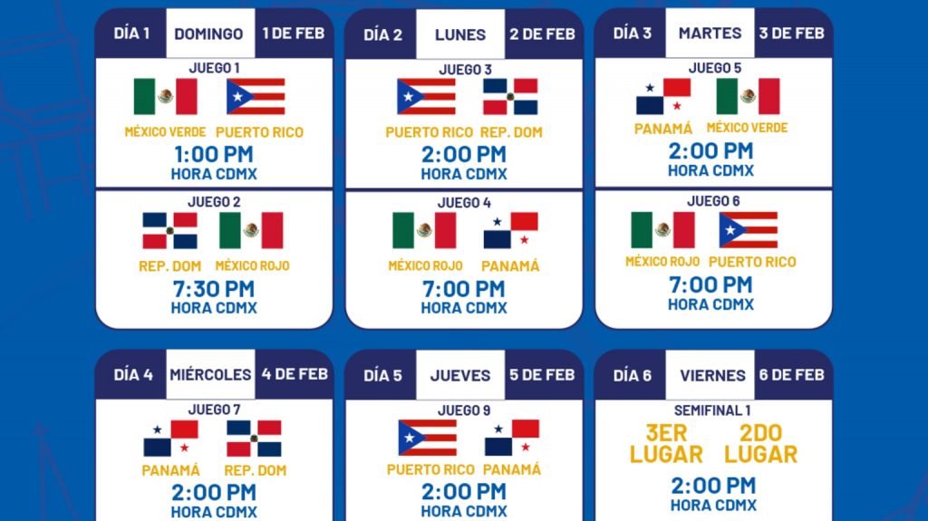 Para el miércoles 4 de febrero, a primera hora, Panamá enfrentará a República Dominicana y posteriormente se disputará el compromiso entre México Verde y México Rojo, con descanso para Puerto Rico. La ronda clasificatoria concluirá el jueves 5, cuando Puerto Rico se mida ante Panamá a primera hora, seguido del encuentro entre República Dominicana y México Verde a segunda, mientras que México Rojo tendrá jornada libre.
