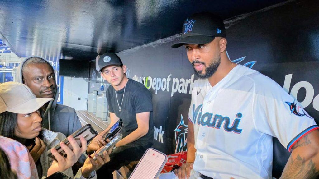 Sandy Alcántara es entrevistado en el LoanDepot Park de los Marlins.